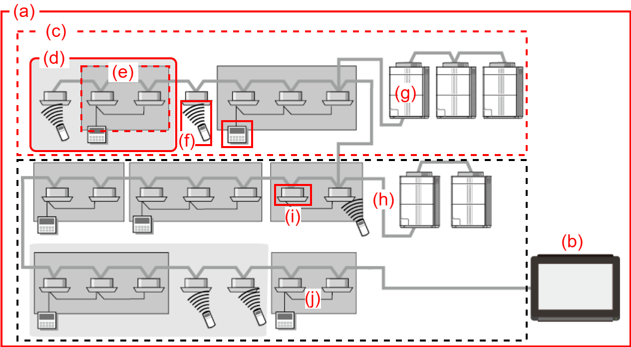 | This is a system composed of units in one refrigerant circuit. It contains indoor units, outdoor units, and relevant control units (the AIRSTAGE Cloud Edge Supervisor and standard remote controllers). | |