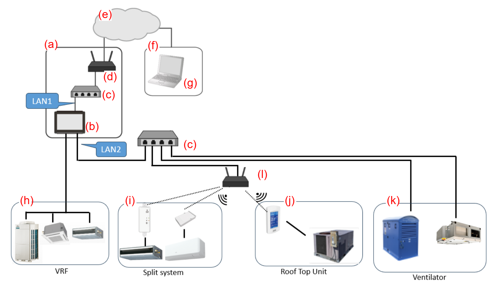 Connect to the Internet using LAN1. Connect to Split System, Roof top unit and Ventilator via LAN2. LAN2 does not connect to the Internet.