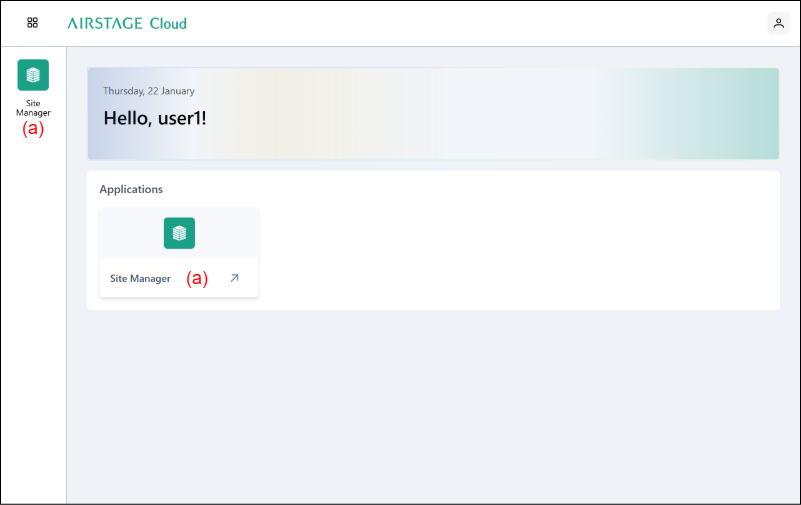 (a) Click on Site Manager to launch the Site Manager application, and the screen transitions to the Portfolio Dashboard. Refer to "Add Site (for Initial Setup)" for the following procedures.