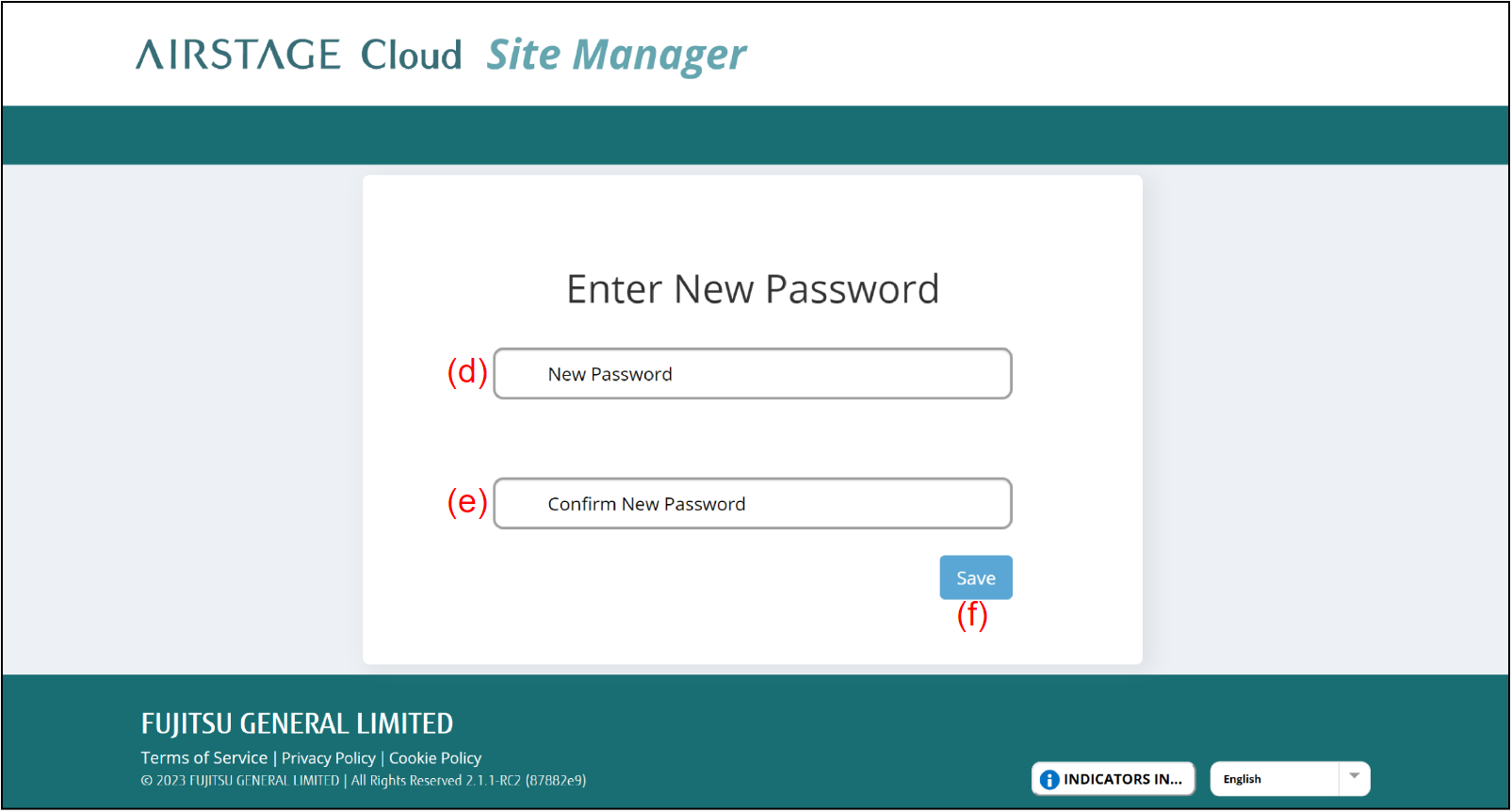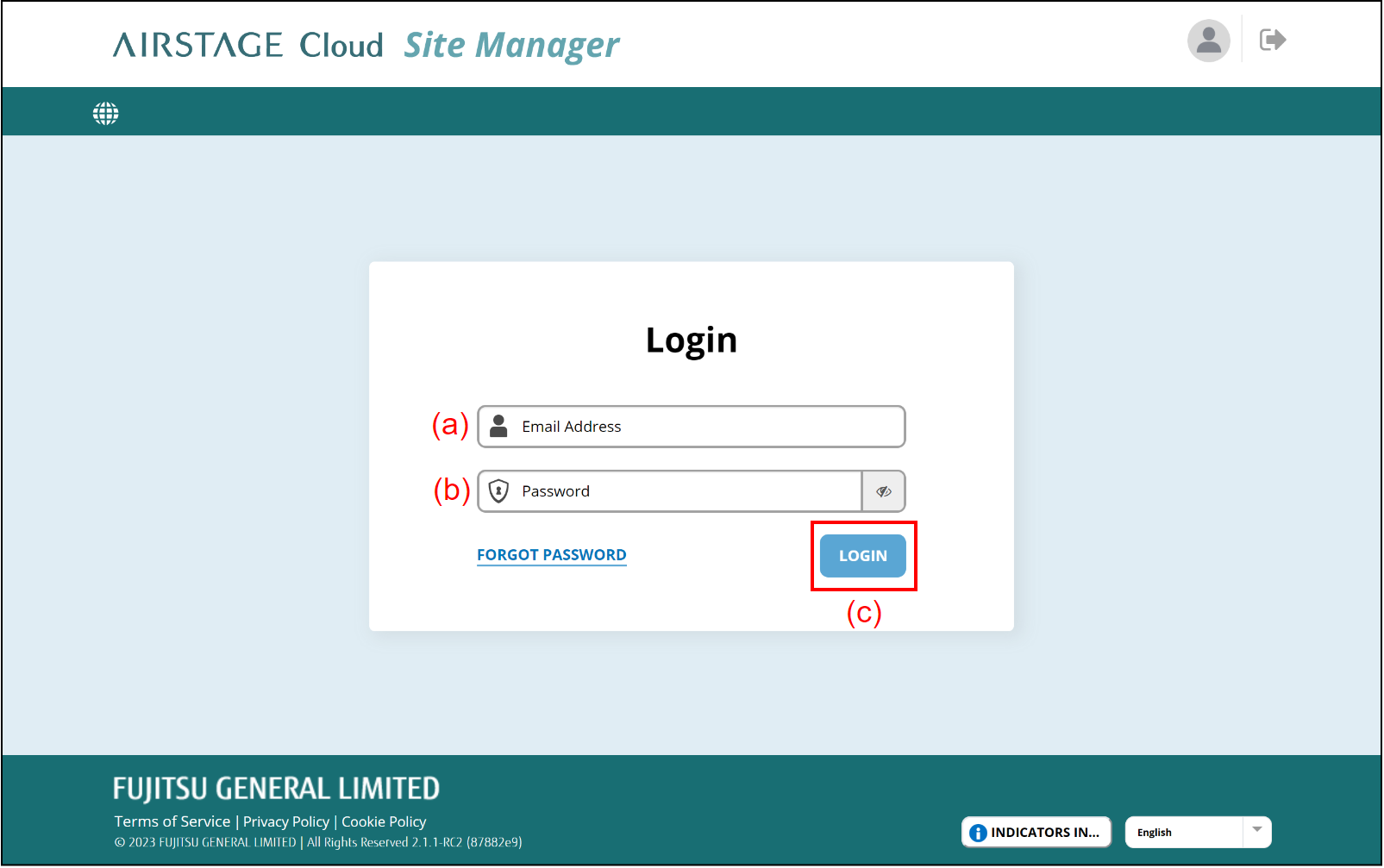 The one-time password is written on the invitation e-mail. It is sent when the administrator creates your AIRSTAGE Cloud Site Manager account. - Select the button (c).