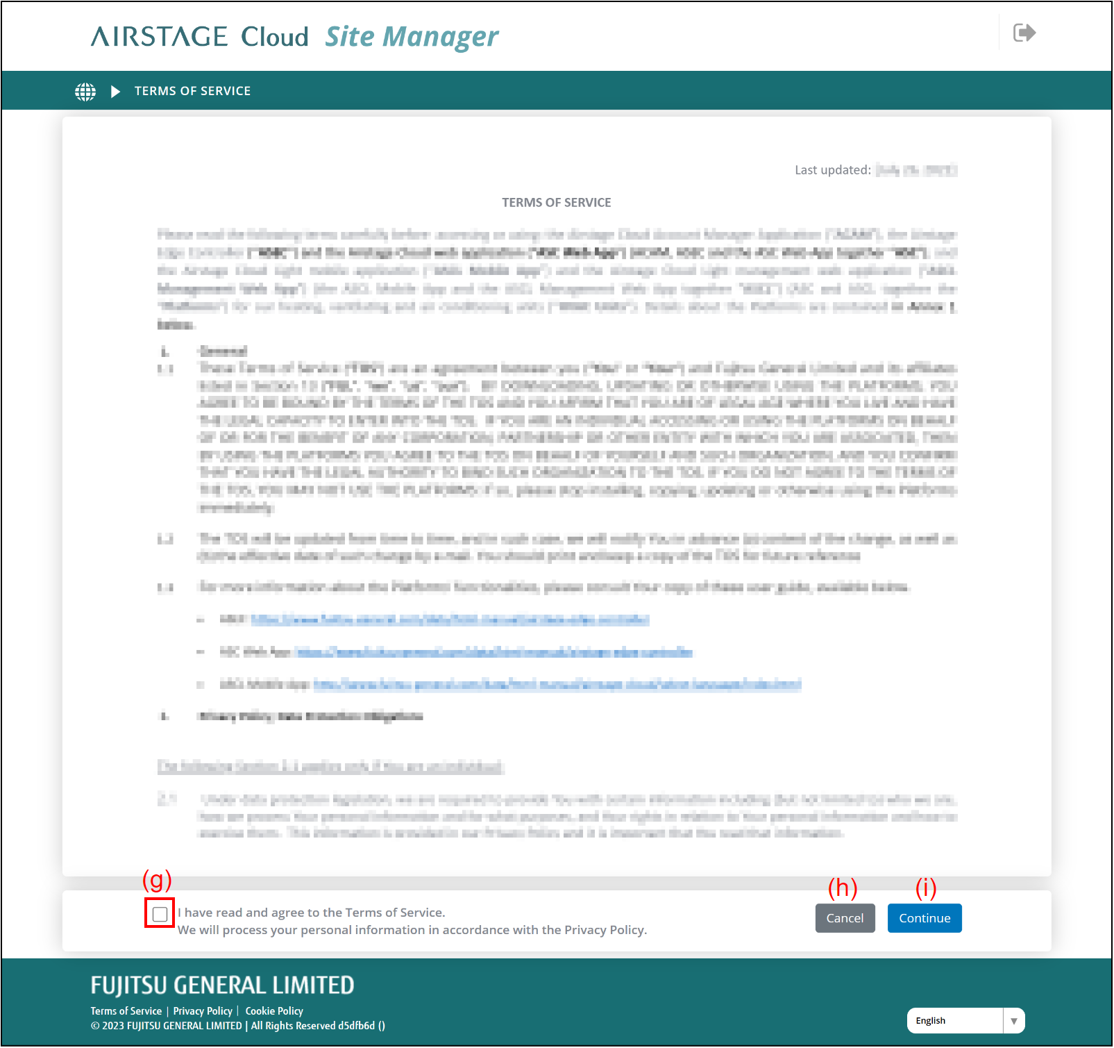The agreement is required to use AIRSTAGE Cloud Site Manager. - Select the button (i).