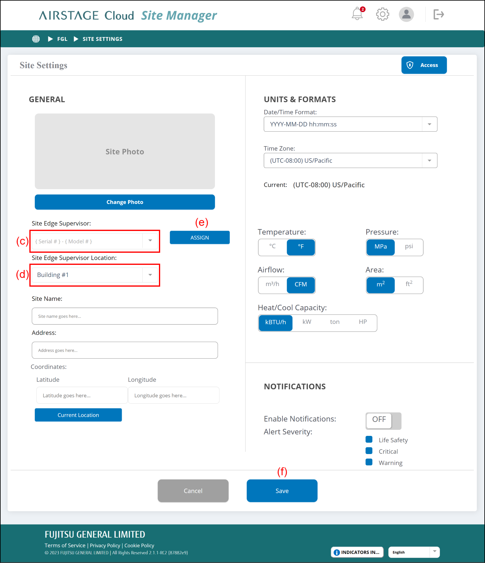 If you do not have it, refer to "Network" on the label on the bottom of the AIRSTAGE Cloud Edge Supervisor. - Select the location of the AIRSTAGE Cloud Edge Supervisor from the pull-down menu (d).