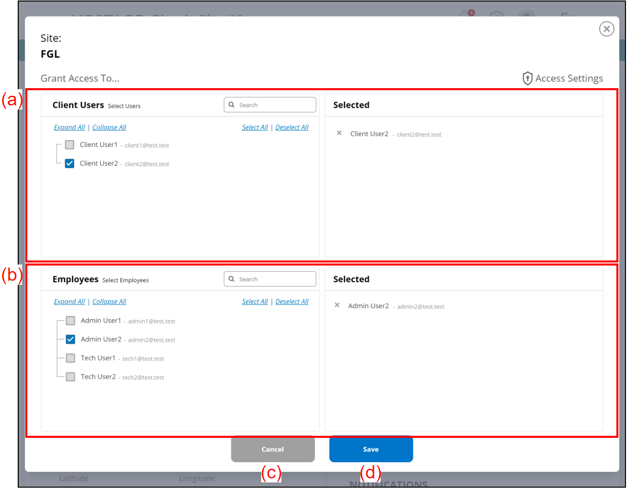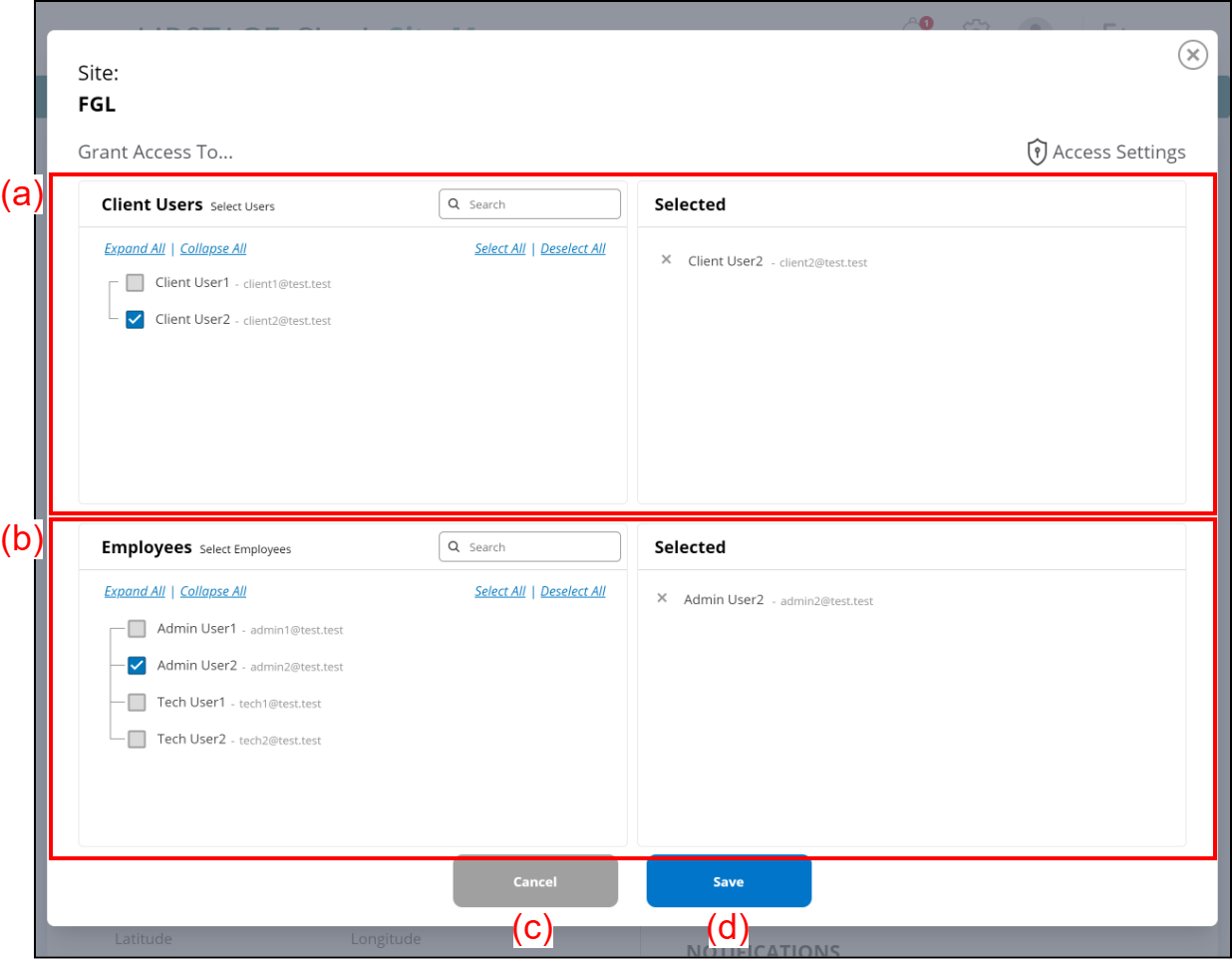 [deselect all] button deselects all client users or employees.To complete the setting, select the [Save] button (d).