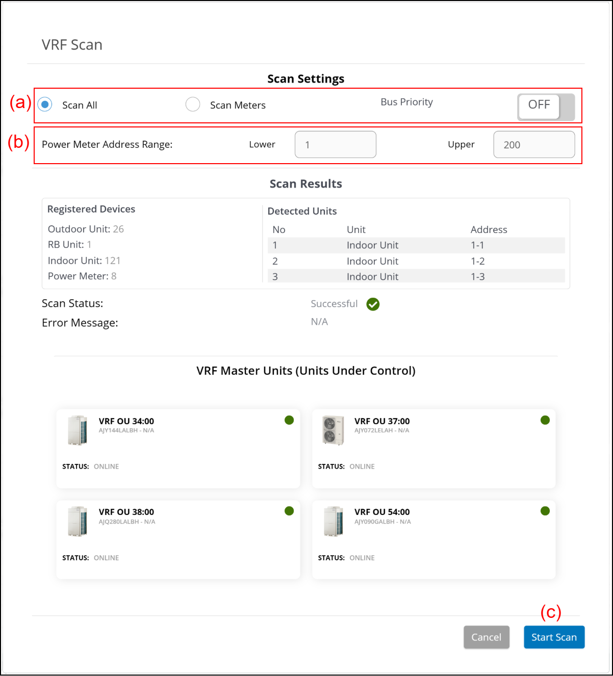 - When “Scan All” is selected, outdoor unit, indoor unit, electricity meter, and RB unit connected to VRF network are all scanned and registered.