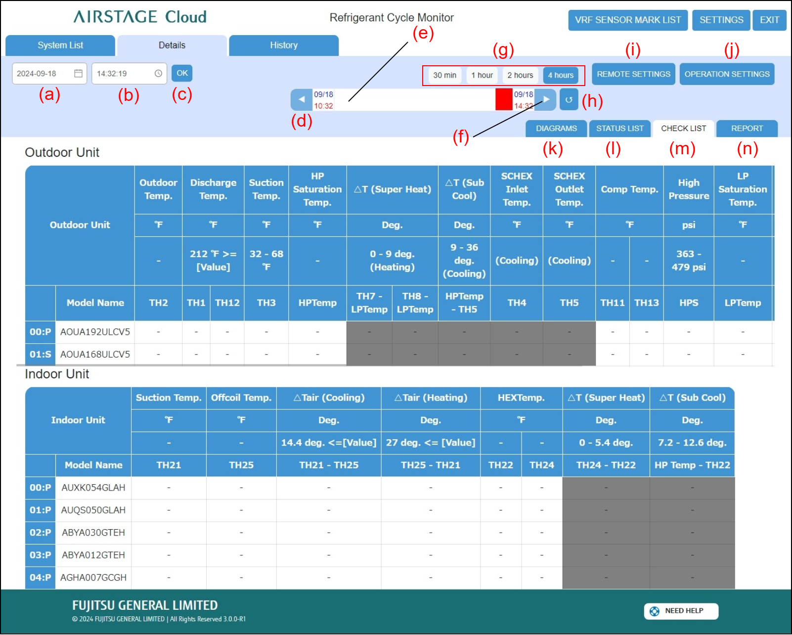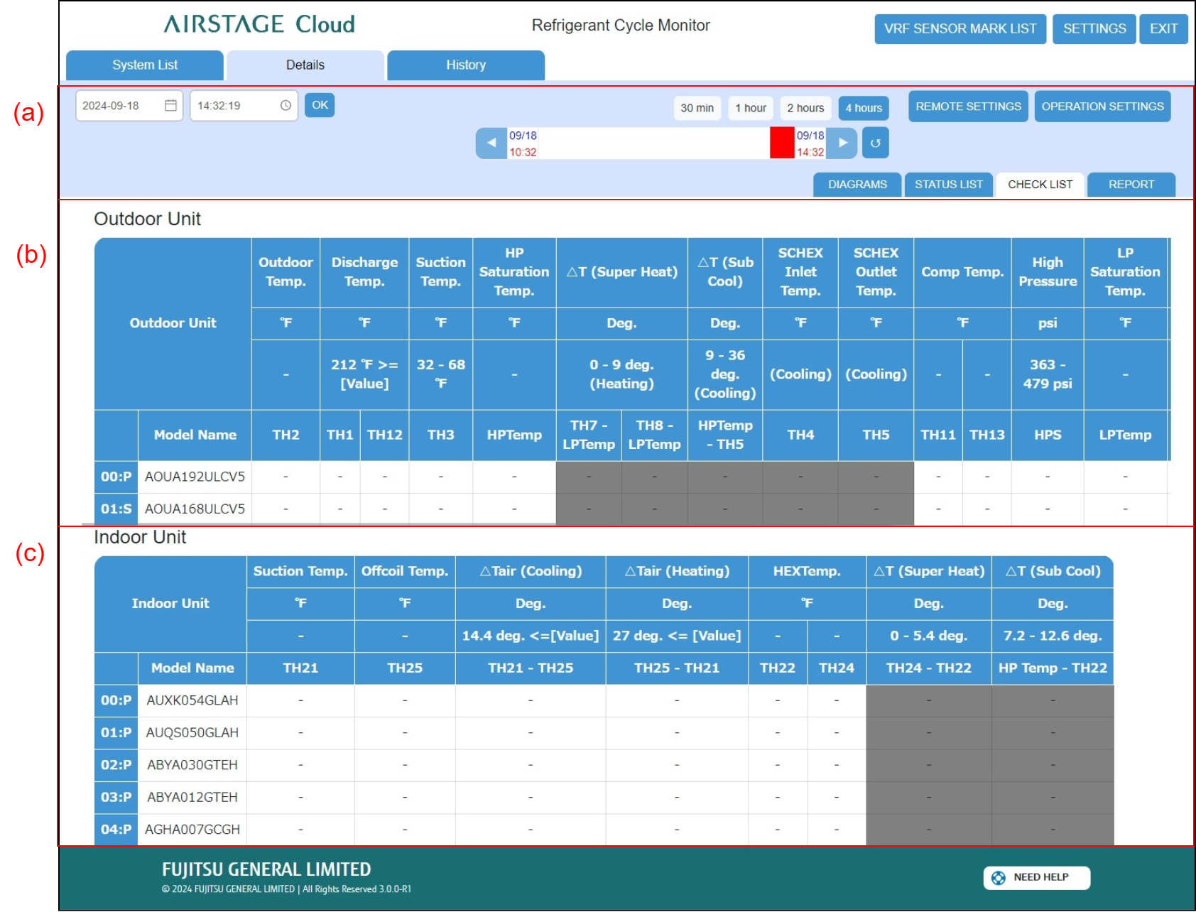 The sensor value calculated in the condition set at Control area is displayed for each outdoor / indoor unit. The judgment results are also displayed. If the calculated sensor value is deviated from the normal value, the background of the data cell becomes red.