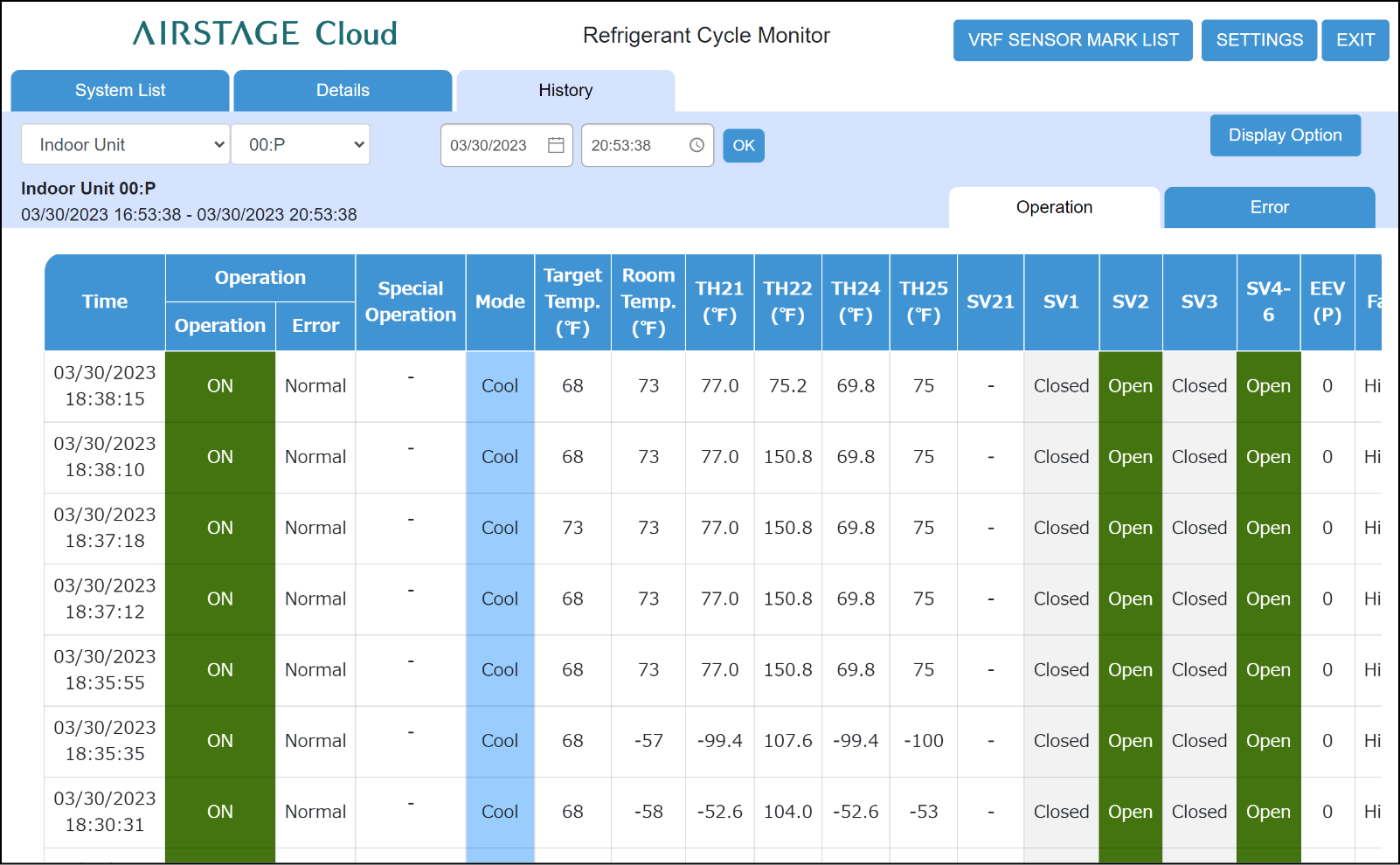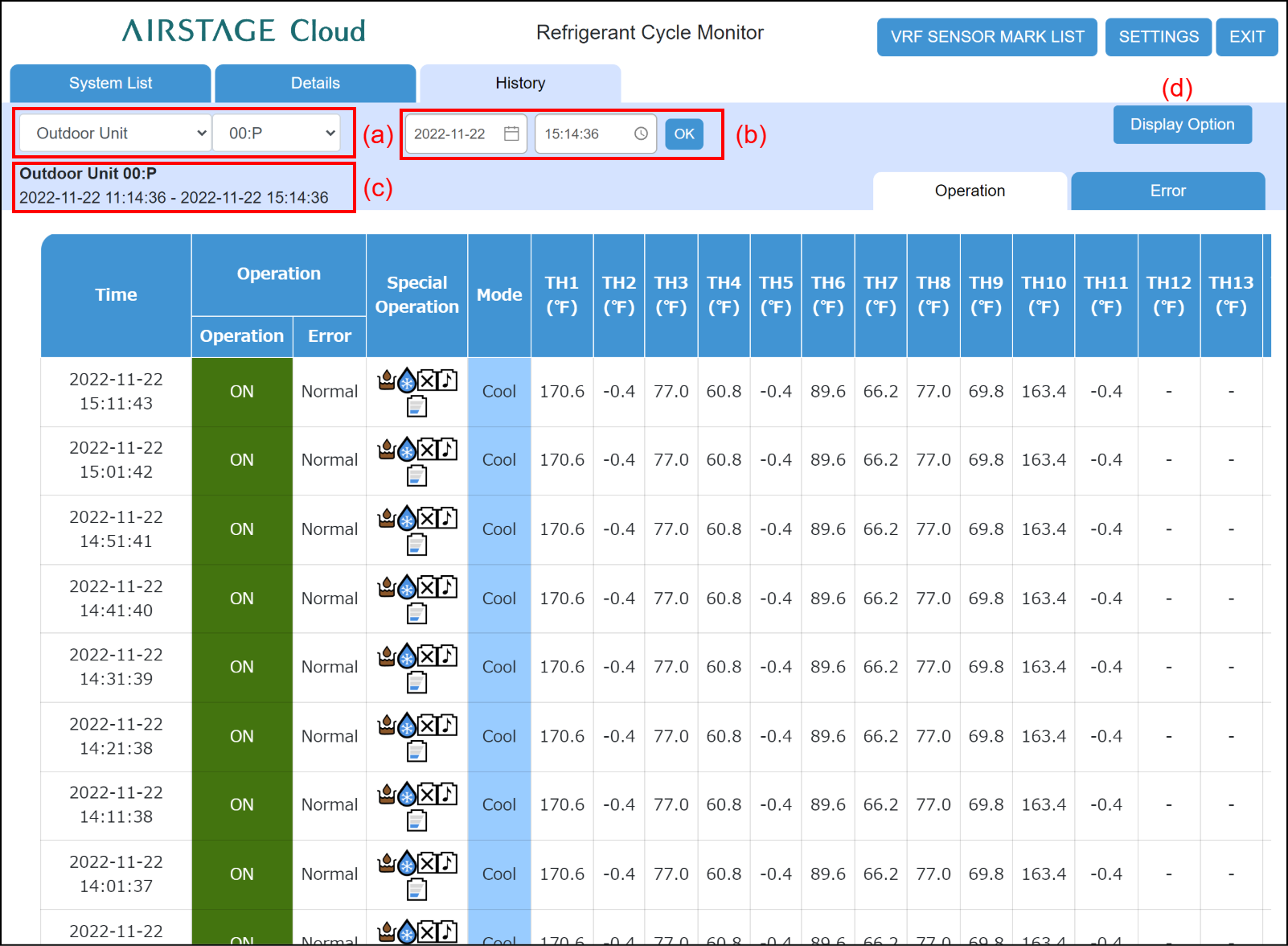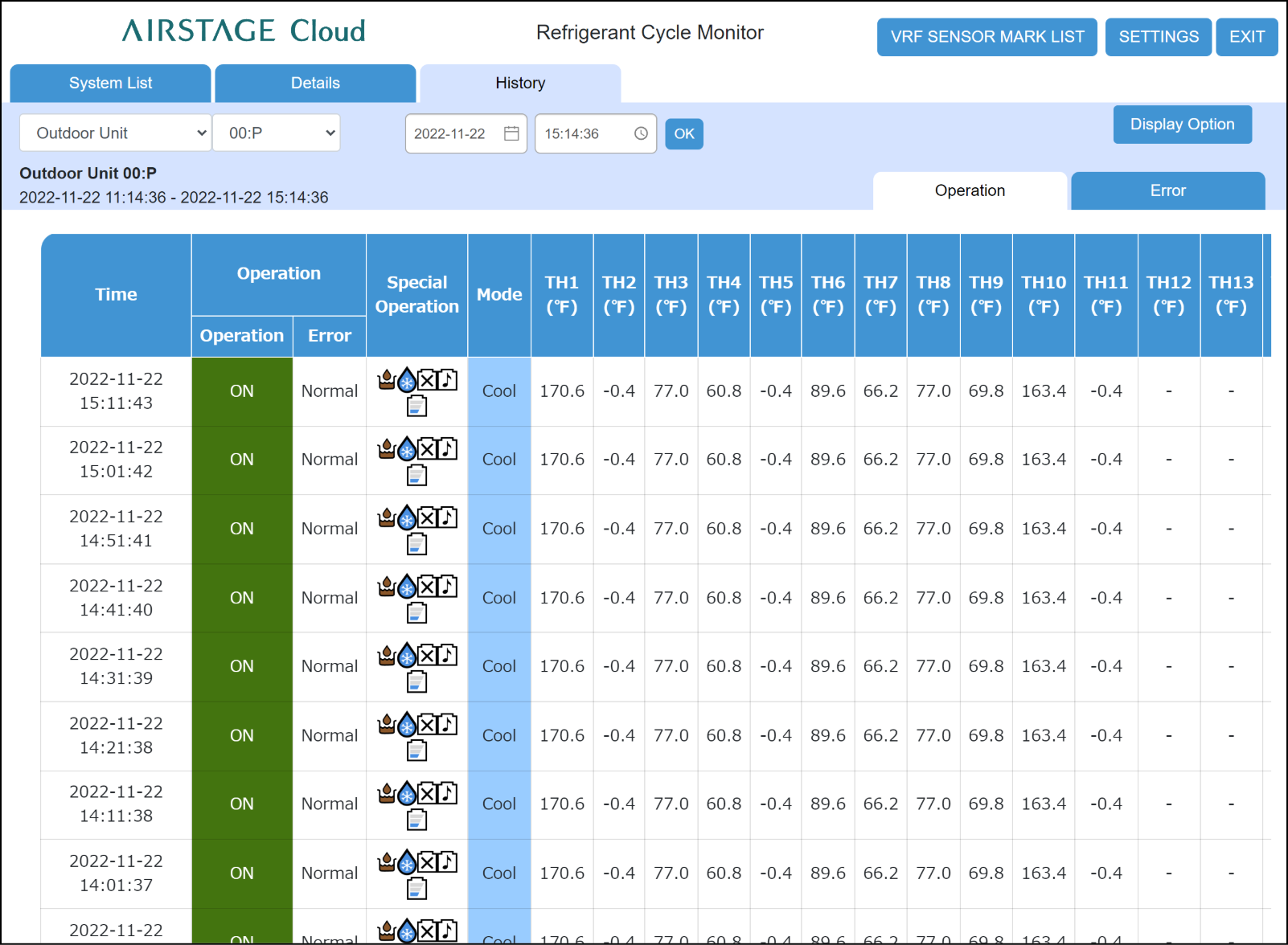 The indoor units or outdoor unit operation history is displayed for each unit.