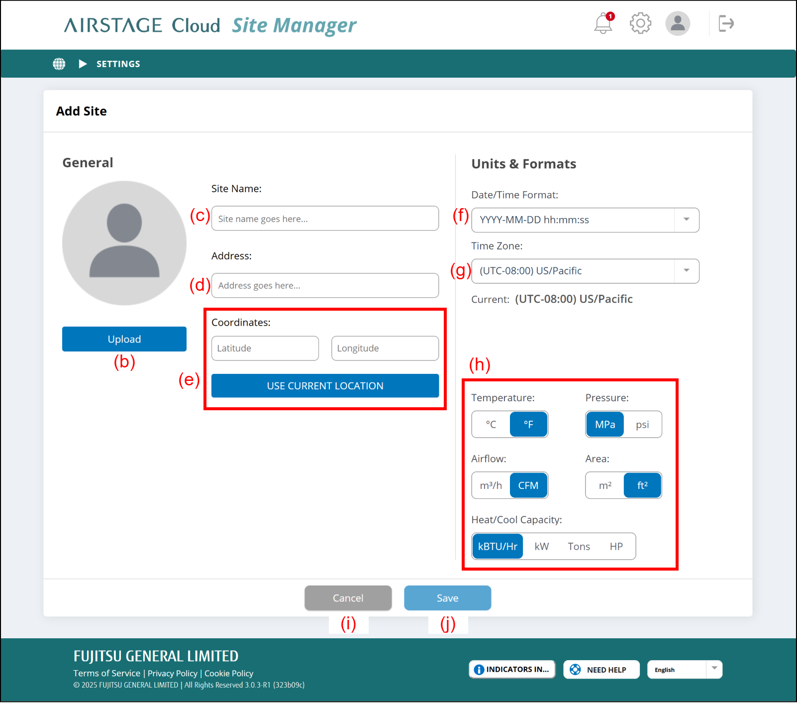 Select the time zone of this Site location from the pull-down menu.(h) Unit settings