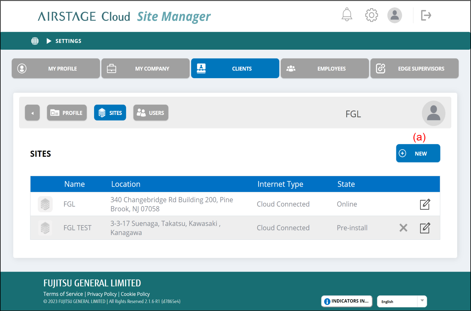 - Select the button (a) on the "Sites" screen in the Client details.