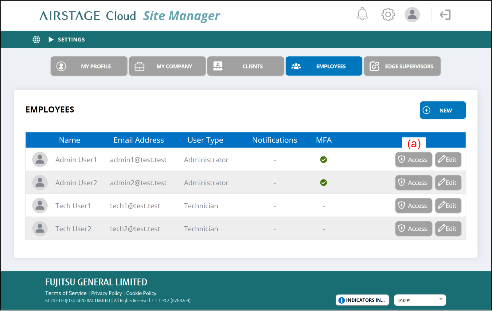 - Select the [Access] button (a) of the employee on the "EMPLOYEES" screen.