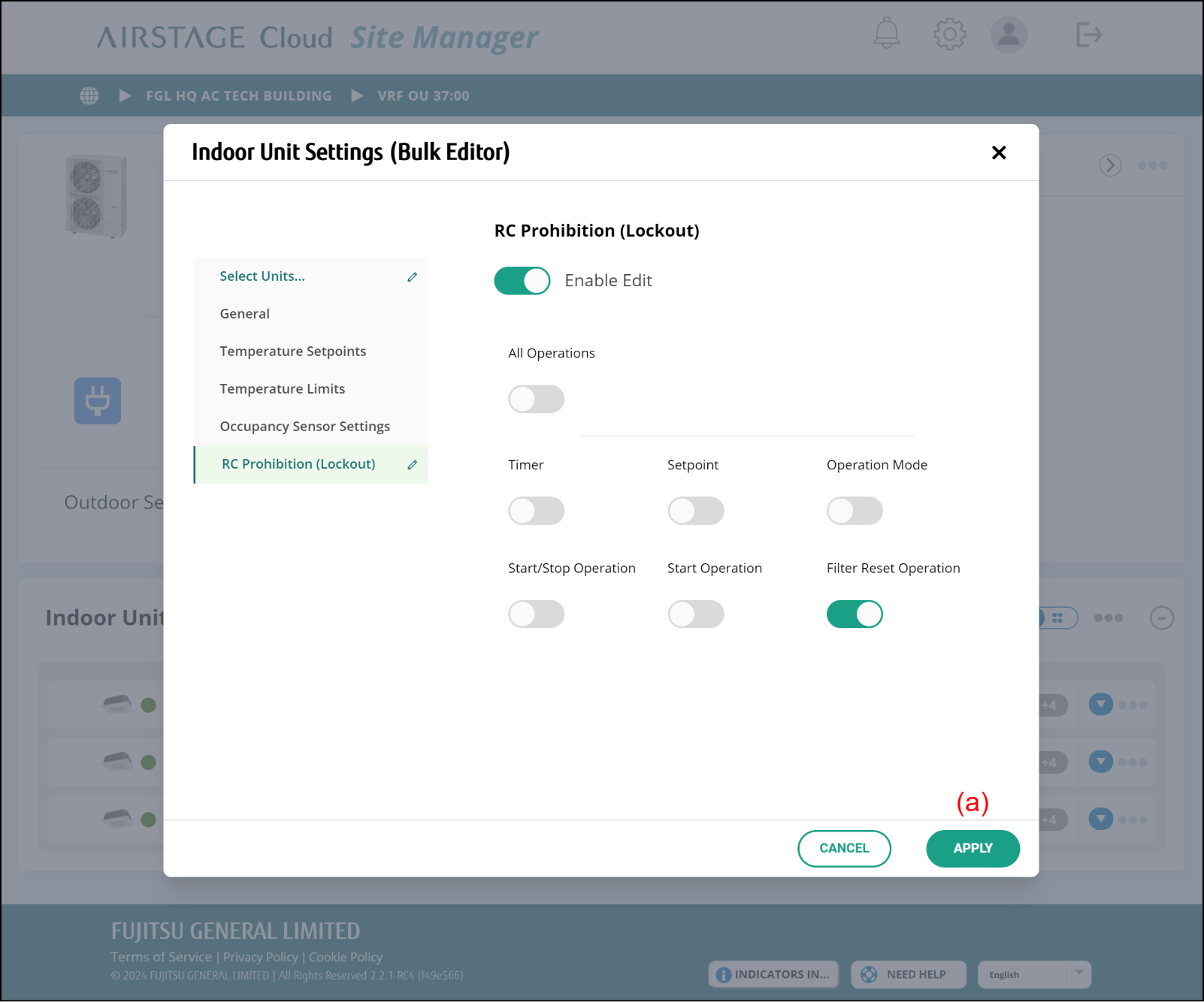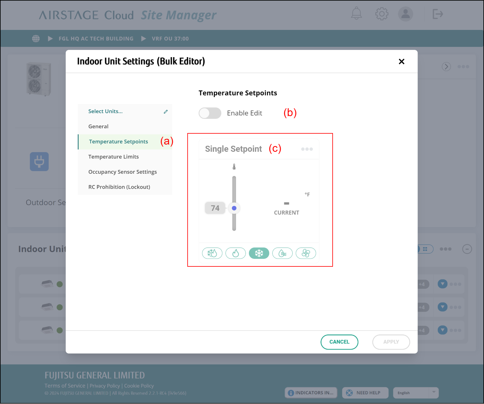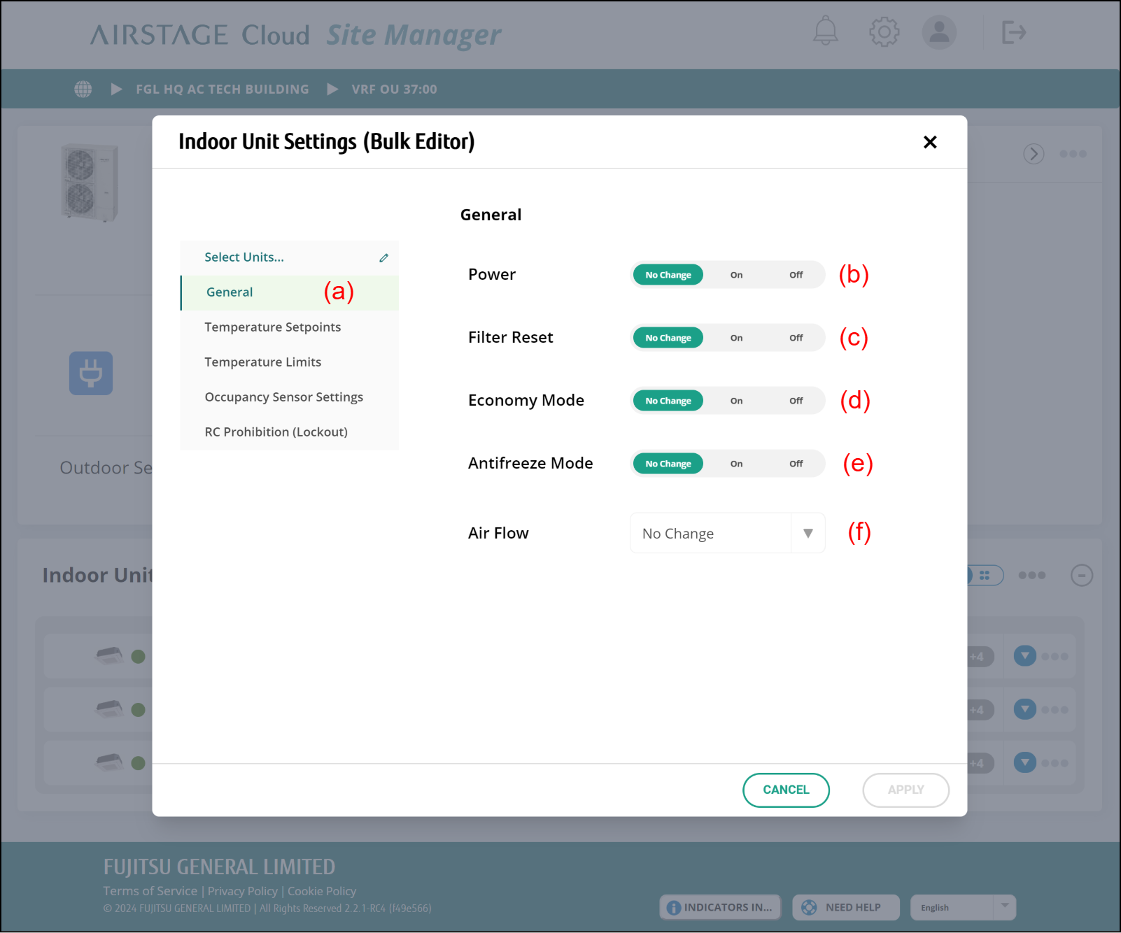 Bulk setting changes for indoor units in this refrigerant system can be performed on the VRF Dashboard screen.