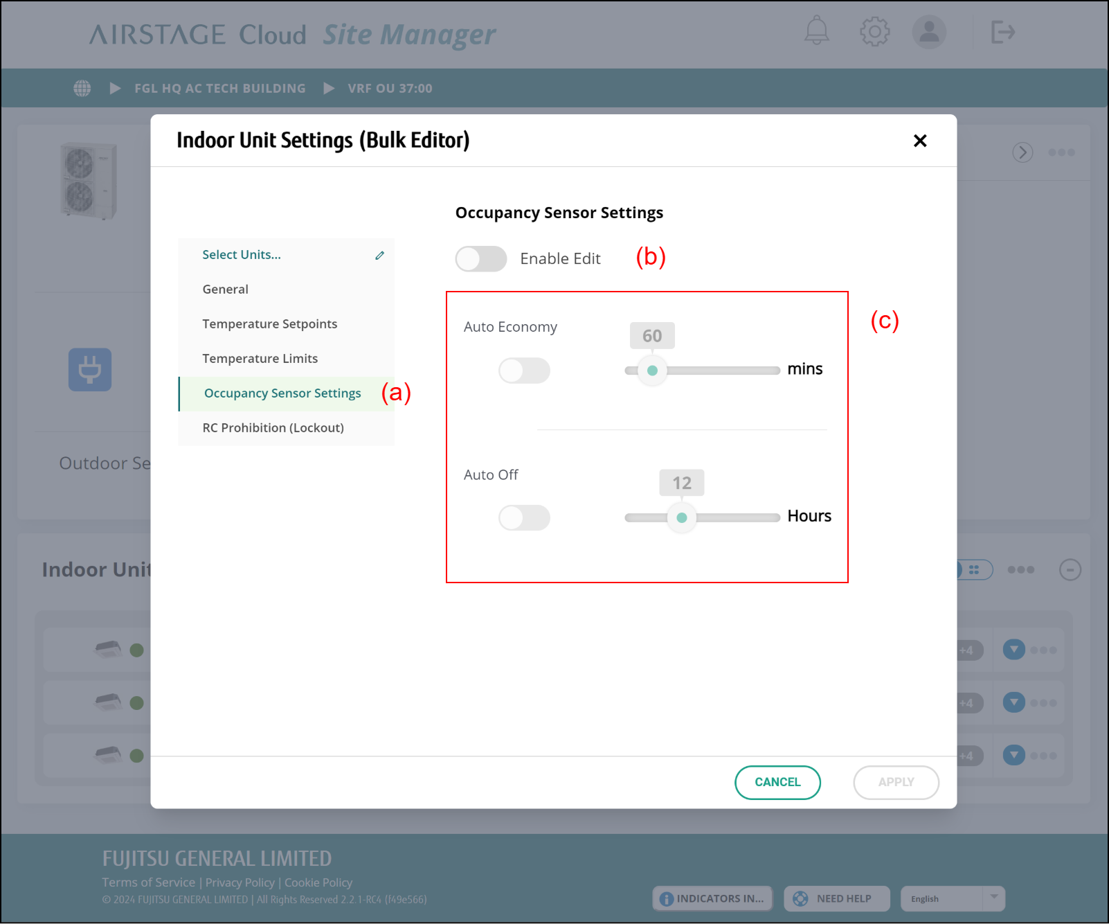 NOTE: Items that do not have the function of Occupancy Sensor Settings cannot be set.