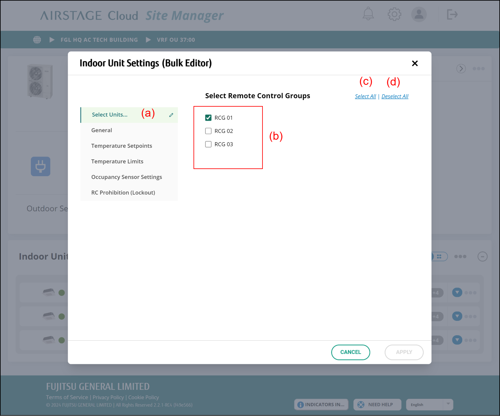 (a) Tap the link menu to open the bulk change modal for the VRF indoor unit. In the bulk change modal, select the indoor unit you want to change, and then select the tab of the function you want to change.