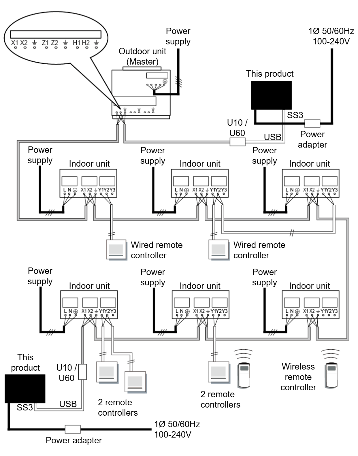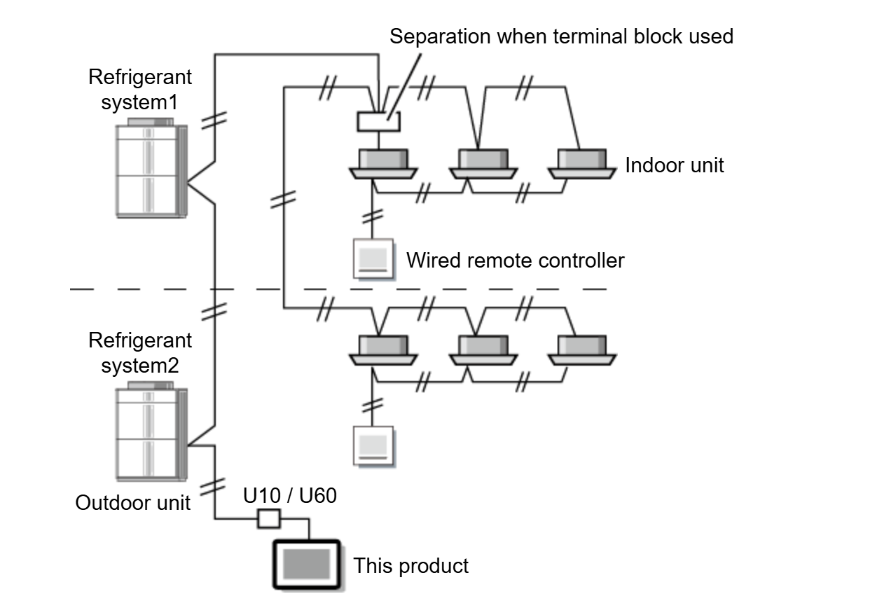 When wiring between the outdoor unit, indoor unit, and this product, refer to the indoor unit and outdoor unit installation manuals.