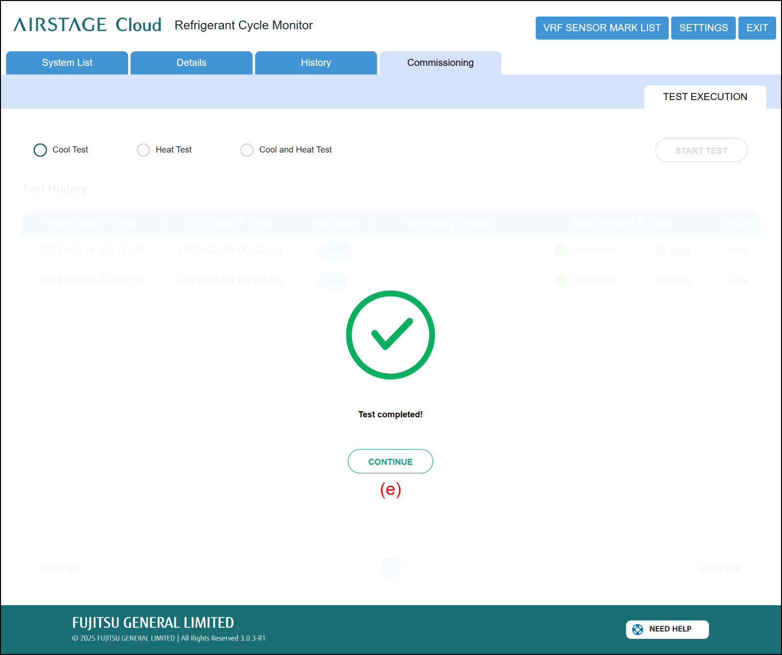 Test execution can be performed as VRF commissioning on this screen.