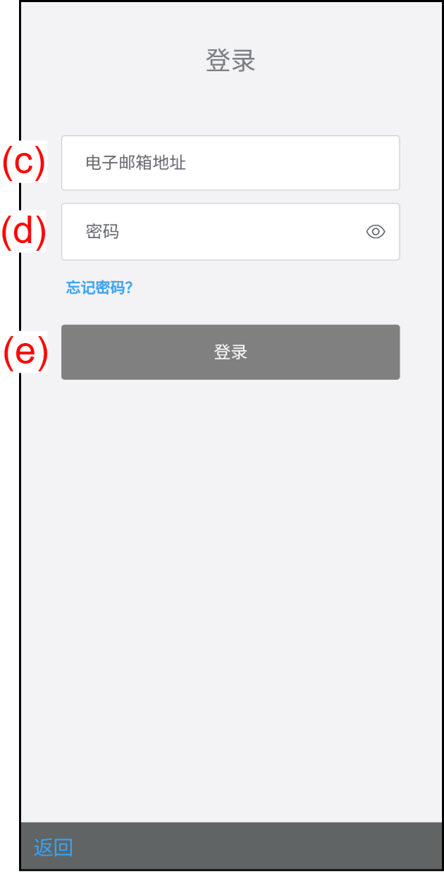 主页 启动本应用程序 登录 轻按[登录] (a)或[登录] (b)以显示登录画面。* 如果您有无线路由器,轻按[登录] (a)。* 如果您没有无线路由器,轻按[登录] (b)。 使用您已注册的电子邮箱地址(c)和密码(d)登录。 如果您有接入点,轻按(e)登录至本应用程序。如果您没有接入点,使用直接控制。参考“直接控制”了解详情。 注: 请勿同时从多台智能手机登录到一个帐户。登录会失败。 如果30天未使用本应用程序,您将自动登出。遵照画面上的指示,再次登录。* 即使您经常使用AIRSTAGE Mobile应用程序,您也会在初次登录一年后自动登出。 如果忘记密码,请参考“遗忘密码时”。